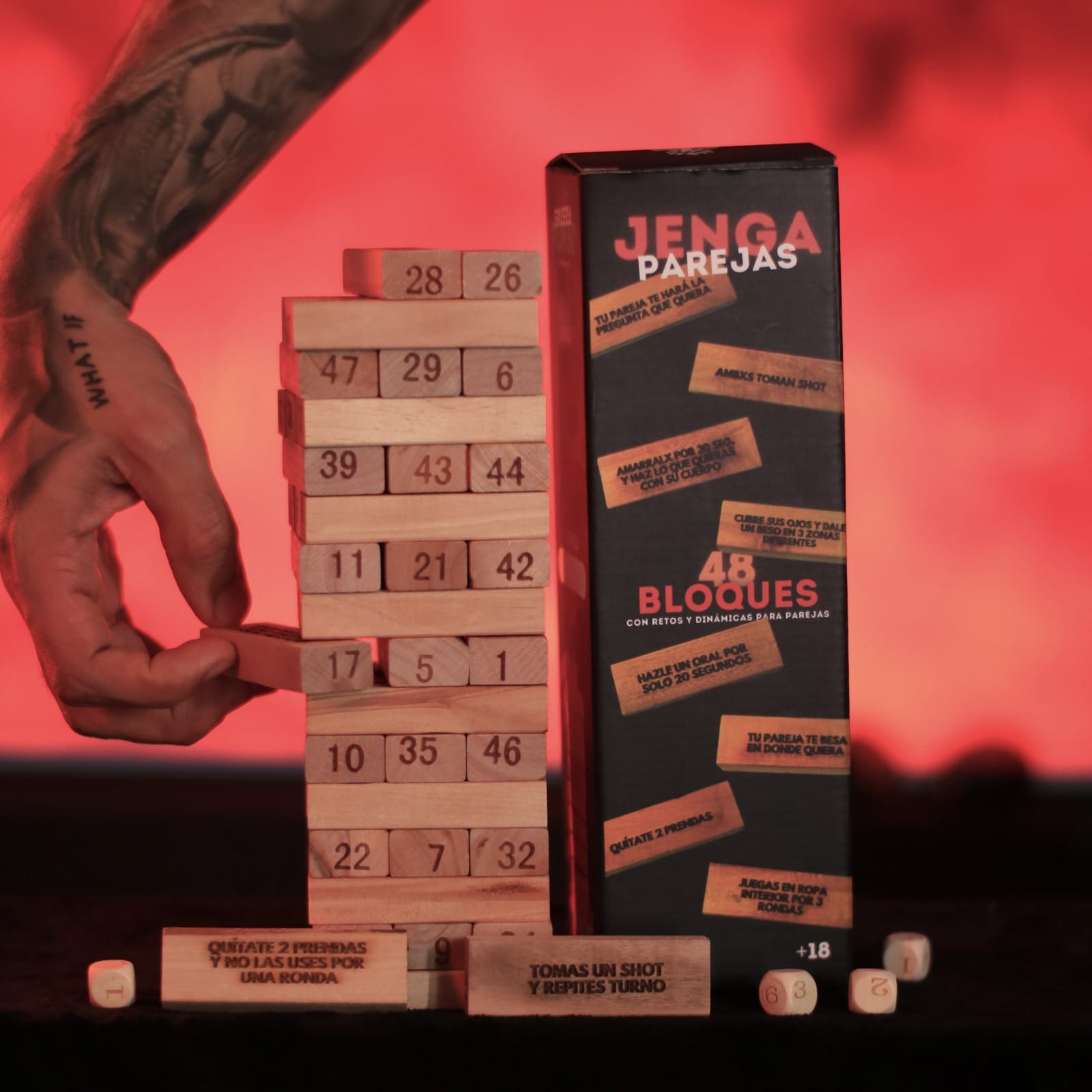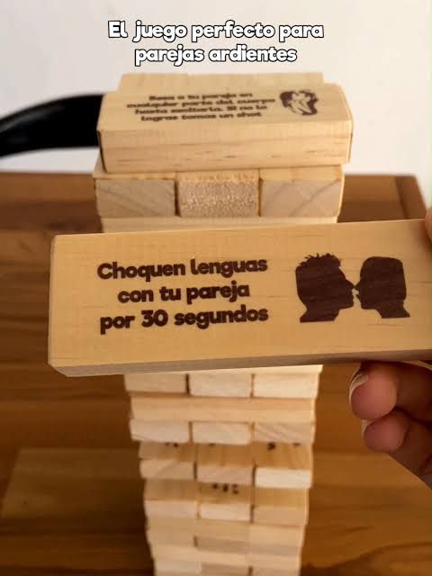 <Sal de la rutina y reaviva la chispa con el Jenga de Parejas. Cada pieza trae un reto, una pregunta o una dinámica que despierta la complicidad, el coqueteo y la diversión. Ideal para citas en casa, aniversarios o sorpresas románticas.